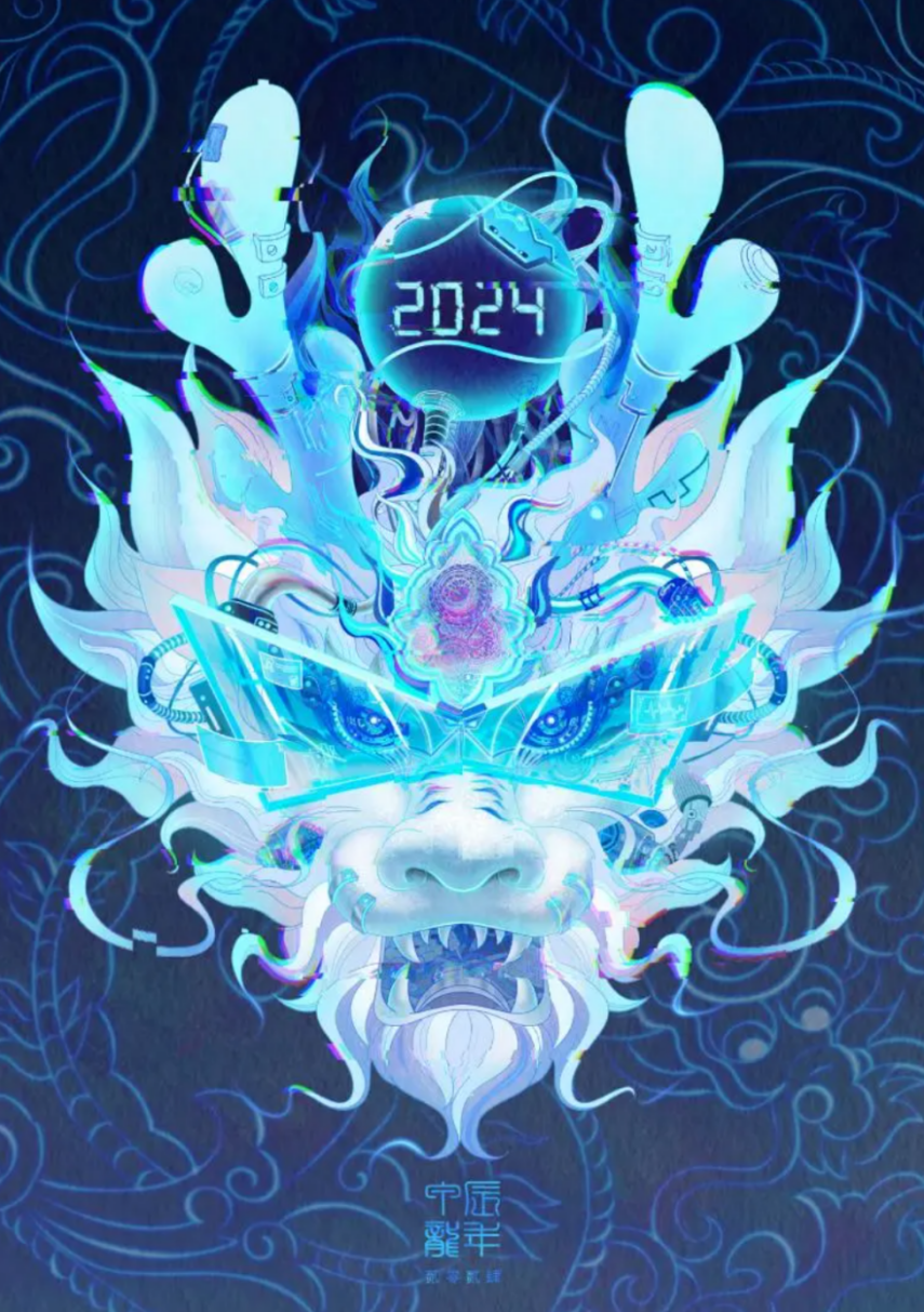 作品介绍:该作品以中国传统文化为出发点,把敦煌壁画纹样当作创作来源,主体为朱红的卡通龙抱福,辅特色藻井作背景。画面下方将龙与2024结合,四角加以祥龙献瑞字体。