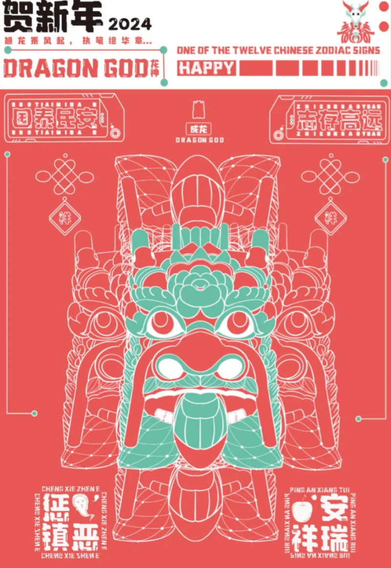 作品介绍:设计主体龙的元素,来源于江西萍乡湘东文化之一的傩文化。以江西省博物馆展出的傩面具为原型进行矢量化再设计。极其色彩主要以红绿为主,而配色的设计思想来源于中国传统年画。整体贯穿机械感。让现代化与传统相结合。设计内容包含中国传统春联、书法印章、中国结等。整体构图采取对称式。将设计元素进行重复再重构。于此同时,在文字编排内容上增加相关寓意与祝福。