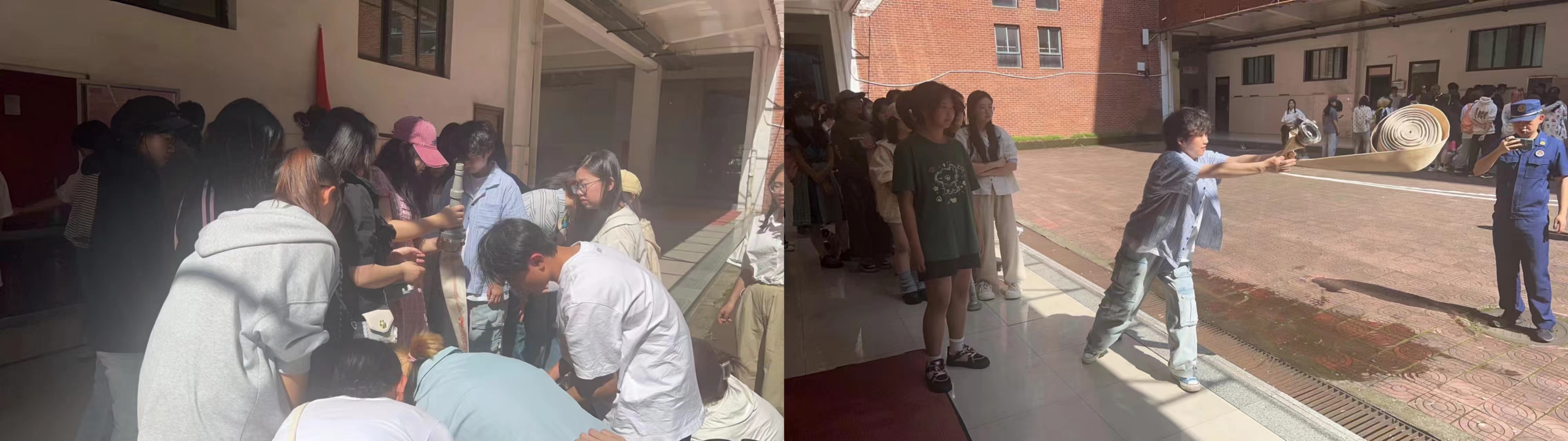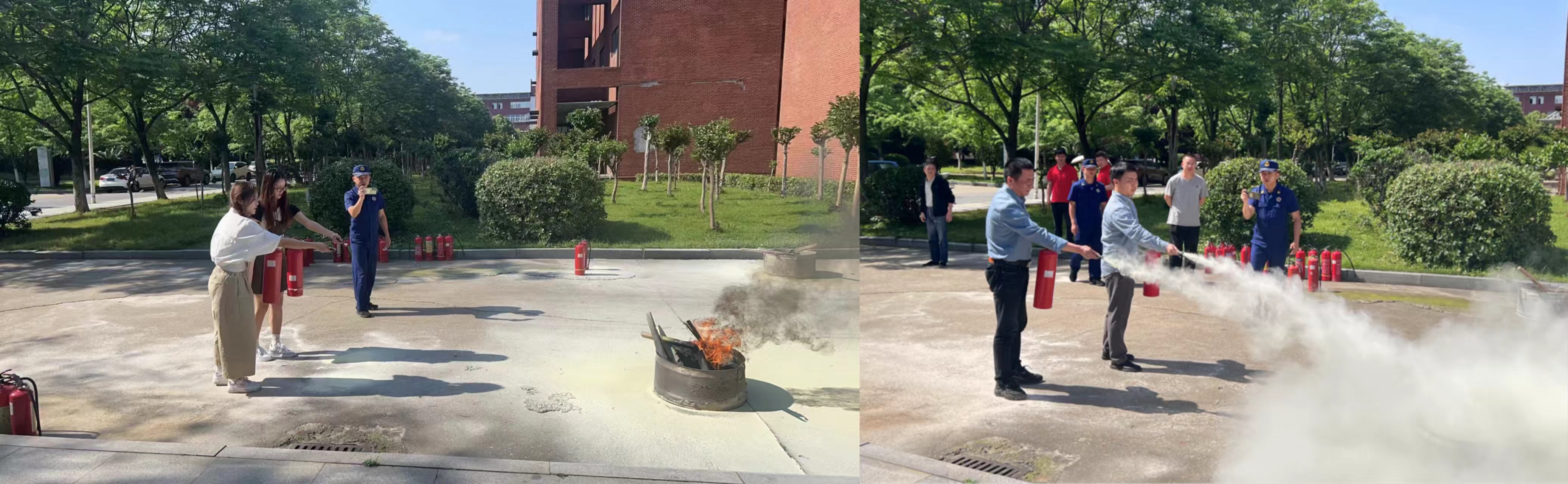 在干粉灭火器的演练中,同学们掌握了“提、拔、握、压”的使用技巧,迅速扑灭了可燃物的着火点。