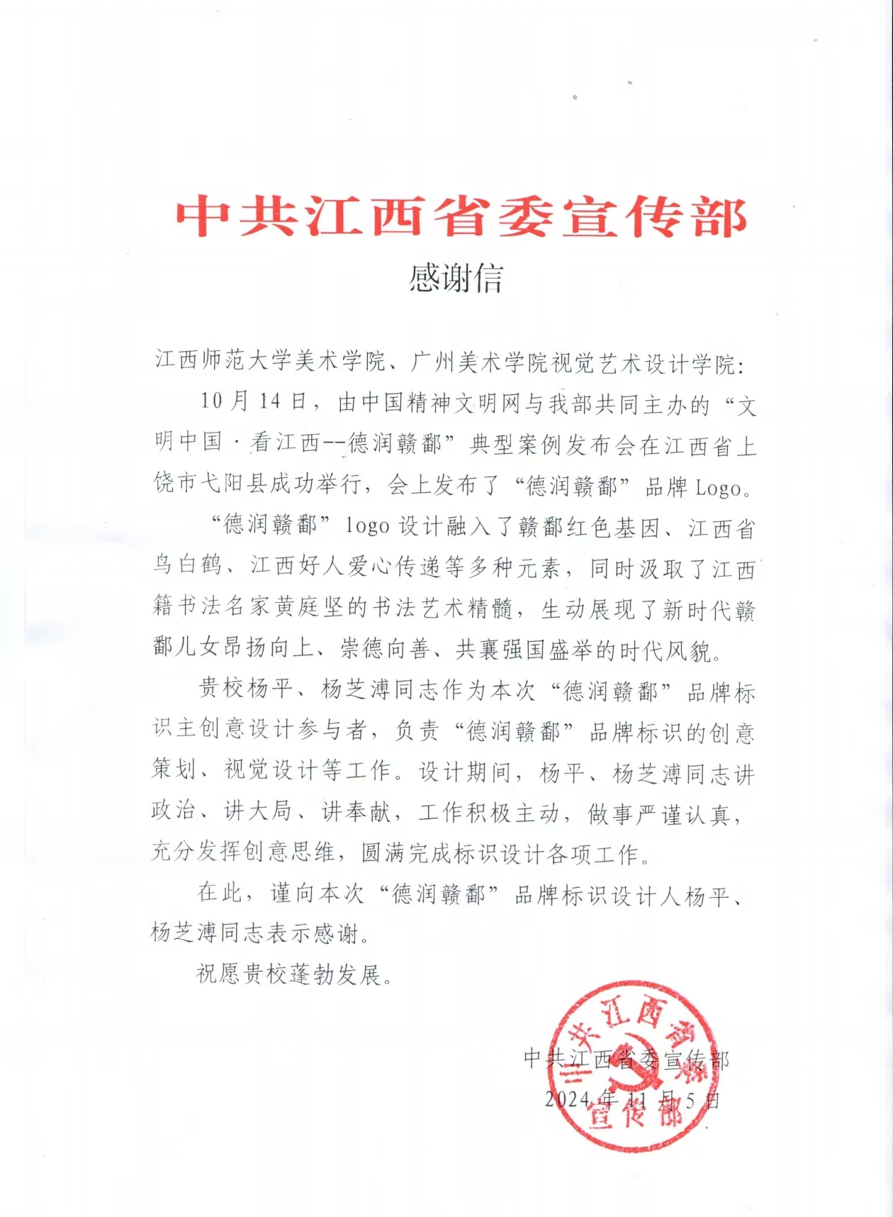 我院杨平教授因在“德润赣鄱”品牌标识设计工作中的突出表现,获得了省委宣传部的高度赞扬,并来函表示感谢。